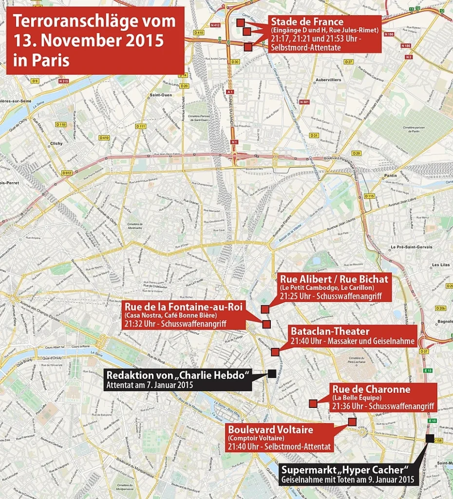 Karte der Terroranschläge vom 13. November 2015 in Paris, Wikimedia.